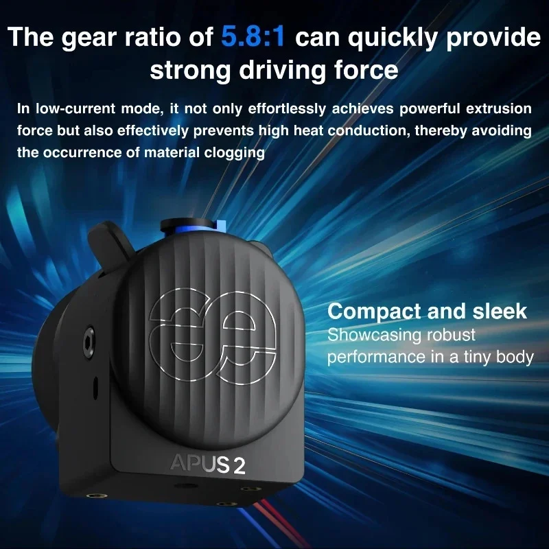 The Phaetus APUS 2 is a lightweight (155g), high-torque dual-drive extruder featuring a 5.8:1 gear ratio, RNC II coated gears for high durability (HV3300), and an integrated filament break sensor. It is designed for high-speed, reliable, and precise printing, offering easy installation, improved heat dissipation, and compatibility with a wide range of materials, including abrasives.
