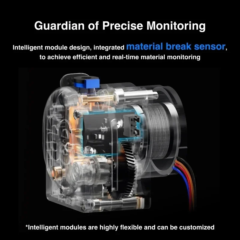 - Integrated Sensor: The unit includes a built-in material break sensor for real-time monitoring of filament status.