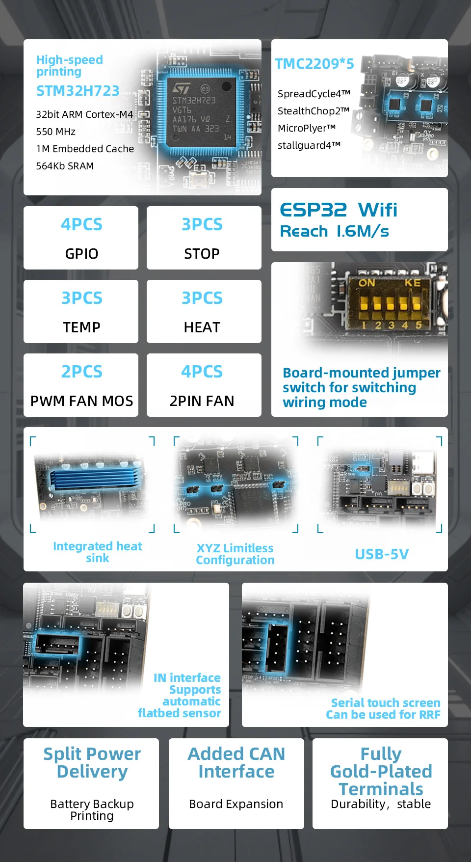 Five TMC2209 drivers on board, XYZ 3 driver positions support infinite bit mode