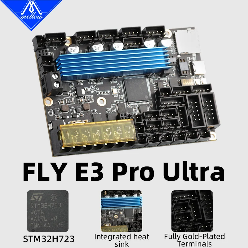The FLY E3 PRO Ultro motherboard features a high‑performance 550 MHz STM32H7‑series processor, engineered for high‑speed 3D printing, with native support for both Klipper and RepRapFirmware. It comes equipped with five onboard TMC2209 drivers to suit various DIY requirements. The board is compatible with the official RRF Wi‑Fi module, enabling web‑based control, online firmware updates, and ultra‑fast file transfers of up to 1.6 MB/s. Its mounting holes match those of the Ender‑3 exactly, so it can be installed as a direct replacement, and it supports both 12864 and serial‑port LCD screens. For Klipper and RRF setups alike, it also supports the popular CAN‑bus communication standard, providing more stable performance and flexible expansion.